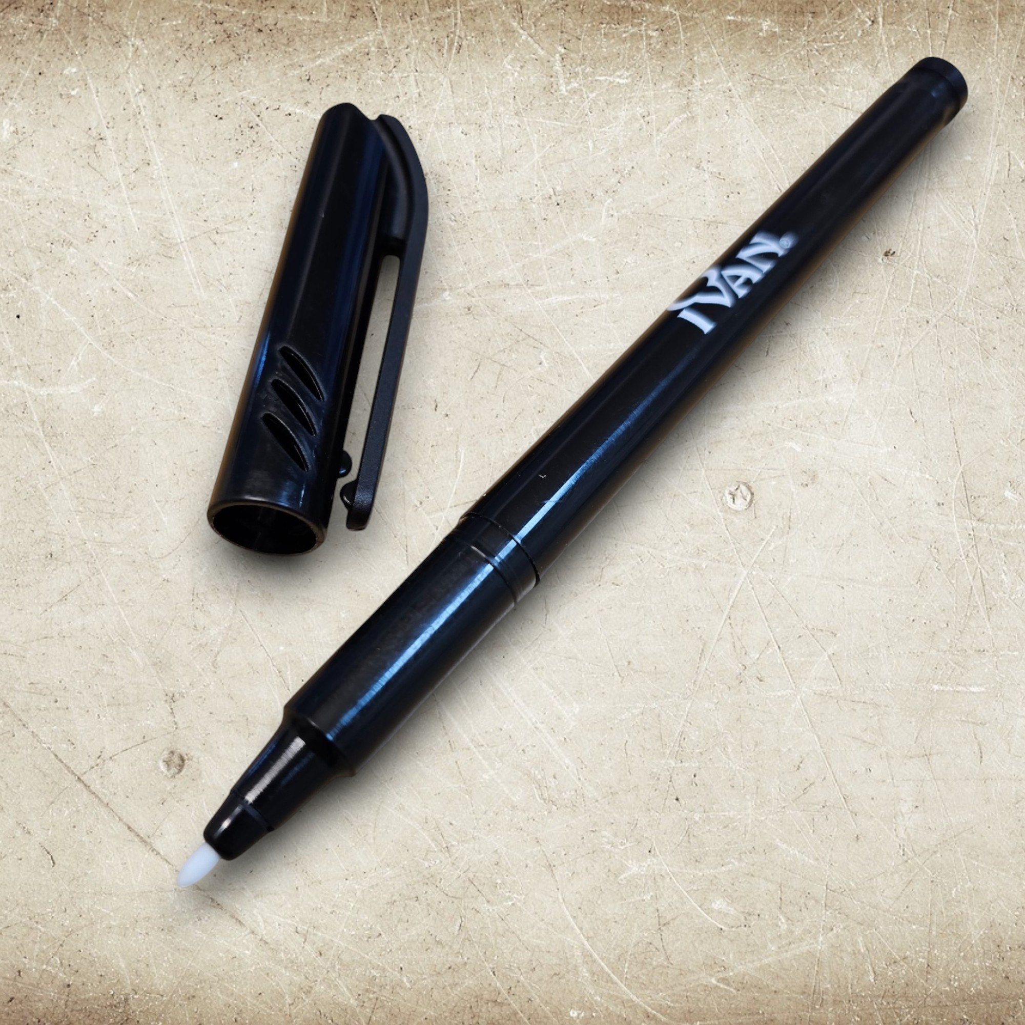 Åpne pennen i toppen, ta ut hylsen, dypp hylsen i lærfargen og sett den inn i penna igjen.