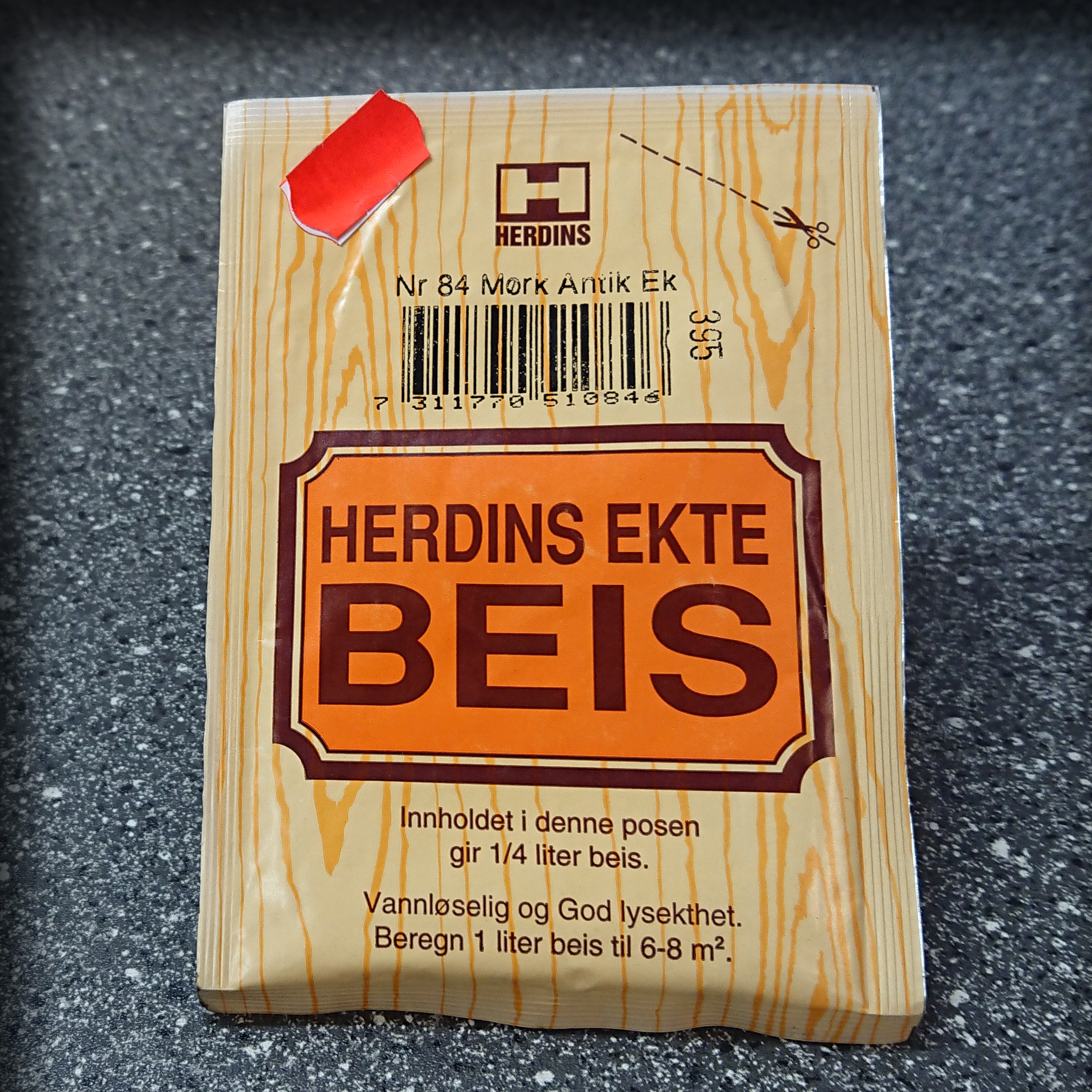 Pulverbeis som blades ut i vann. Gir 1/4 liter beis.