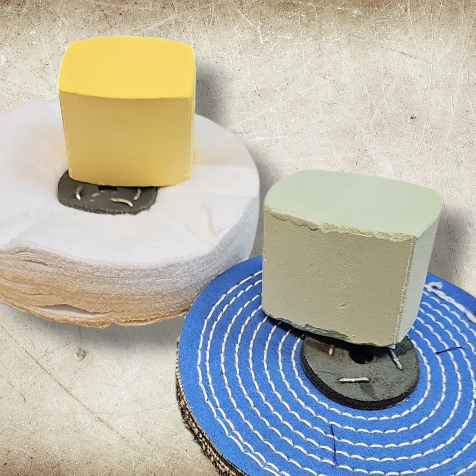 1. Polerskive Mellompolering denim + Slipevoks medium for alle metaller